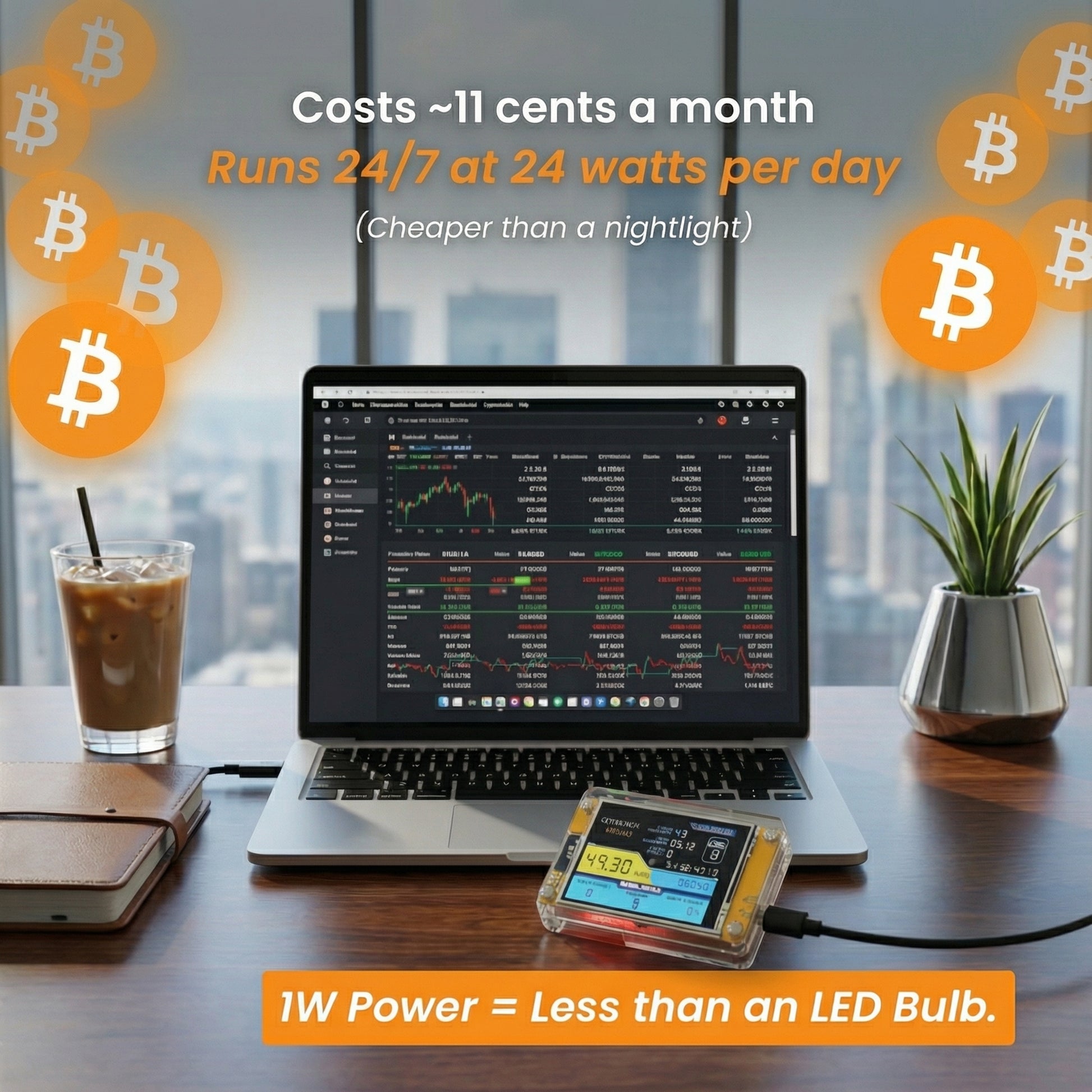 Scared of the heavy electricity bills often associated with typical BTC mining? The MinerForge Pro is built to run 24/7 at just 24 watts per day, which equals only about 0.72 kWh a month (∼11 cents per month) to run nonstop.